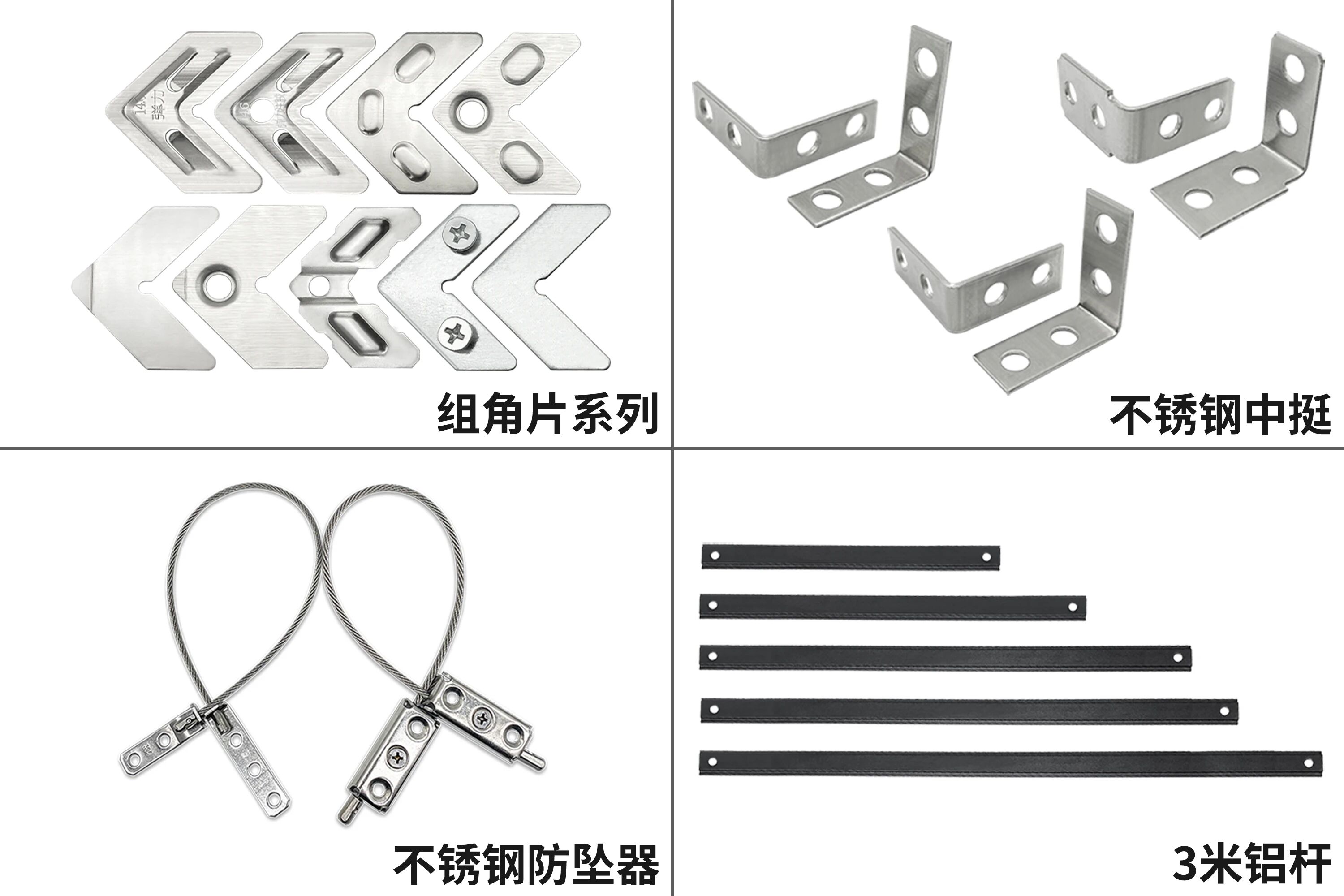 · 主营产品:不锈钢组角片,不锈钢中庭,不锈钢防坠器,不锈钢滑撑,铝杆等